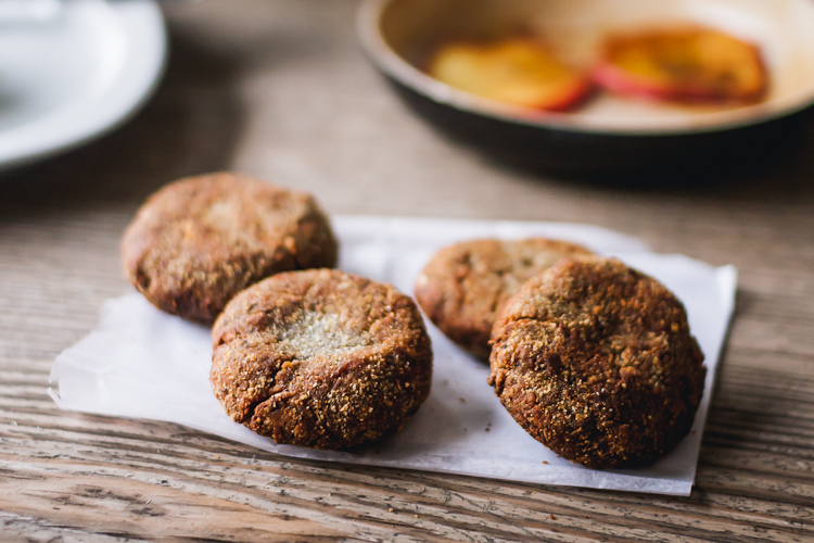 Do przygotowania burgerów użyłam zielonej soczewicy, gotuję ją około 60 min (bez wcześniejszego moczenia, nie jest ono wymagane) i miksuję na pastę. Koniecznie należy przestrzegać czasu gotowania, aby jej nie przegotować, może wtedy stracić swoją mięsistość i wilgotność. Czekam, aż pasta trochę przestygnie i dodaję kolejno posiekany koperek, uprażone migdały, czosnek, bułkę tartą, otręby, jajko i przyprawy, a następnie wszystko dokładnie mieszam na gładką masę. Na osobnym talerzyku odsypuję odrobinę bułki tartej, w której obtaczam uformowane medaliony i kładę na rozgrzaną na patelni oliwę z oliwek. Burgery smażę do uzyskania złocistej barwy z obu stron. W międzyczasie kroję jabłka i smażę na patelni z dodatkiem sosu sojowego i odrobiną miodu.