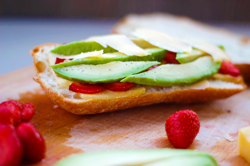 Uwielbiam słodko- słone połączenia, zwłaszcza owoców i serów. Idealnie sprawdzają się na kanapce. W tym przepisie słodycz truskawek i słony smak sera cheddar wypełnia lekko mdłe i mięsiste awokado, które jednocześnie łagodzi i wyostrza pozostałe smaki  nadając im swoistej harmonii. Wypróbujcie koniecznie to połączenie! Alternatywą jest użycie tych składników w sałacie i podanie z opieczonym pieczywem, aczkolwiek wersja z grillowaną ciabattą to mój zdecydowany faworyt.