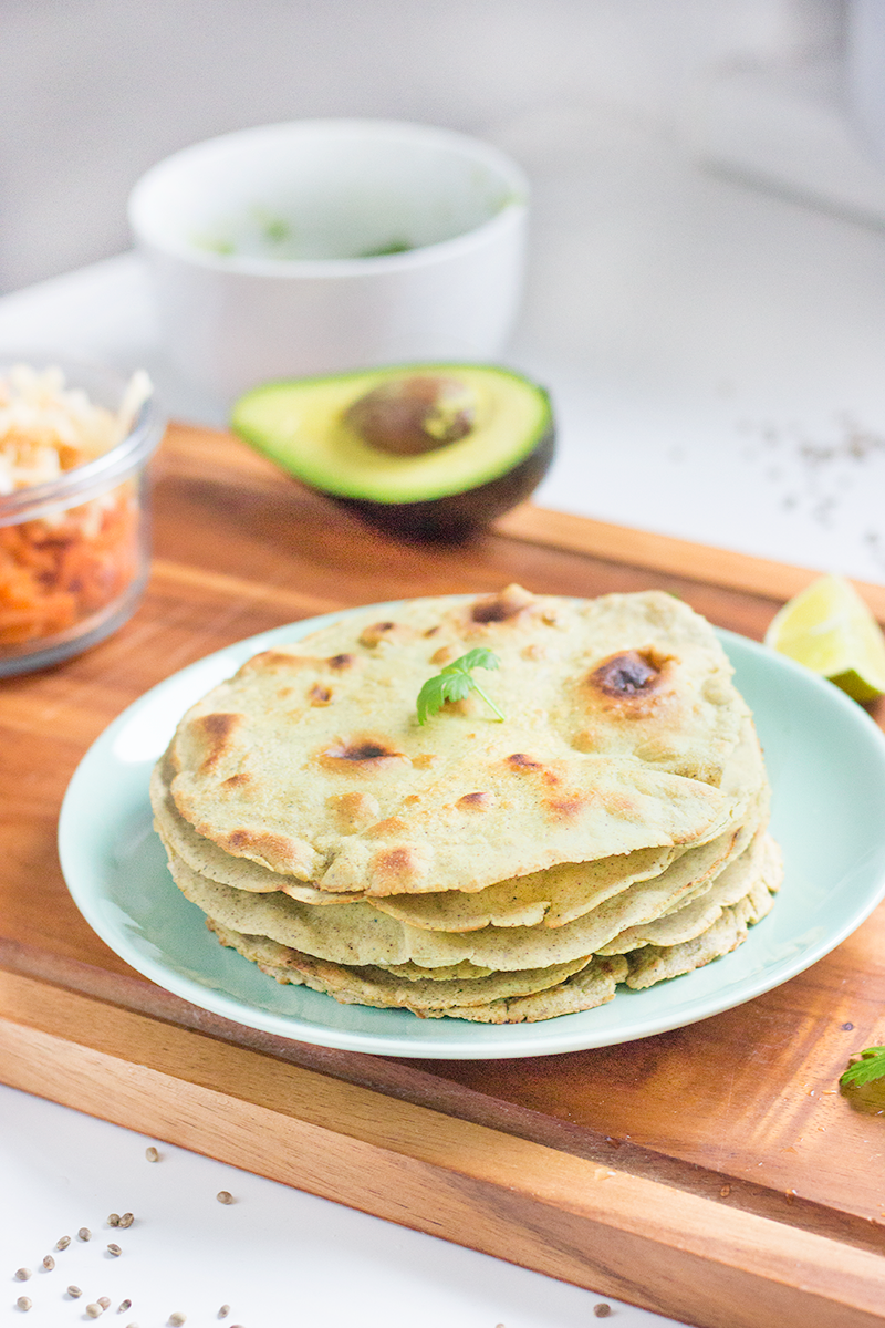 Przygotowując domowe tacos użyłam 15% mąki konopnej, 50% mąki kukurydzianej, 35% mąki pszennej. Efektem czego powstało ciasto o bardzo przyjemnym kolorze i fakturze, które zamieniło i się w chrupiące i pyszne tacosy. Mimo tak niewielkiego udziału procentowego mąki konopnej, to ona jest tutaj dominującą, ze względu na jej wyraźny orzechowy aromat, bogaty kolor no i ciężkawą fakturę.