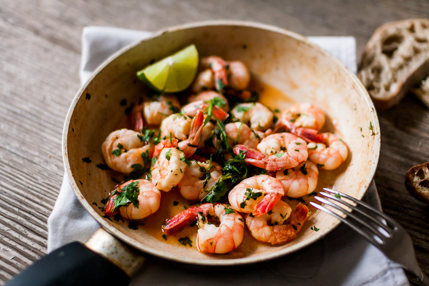 Marynata składa się z soku z limonki, cynamonu, pieprzu, sosu sojowego i świeżej natki pietruszki. Po leżakowaniu krewetki (w pancerzach) razem z marynatą wrzucam na rozgrzaną na patelni oliwę z oliwek i dodaję odrobinę czerwonej pasty curry a następnie smażę kilka minut. Podaję w sosiku, który został na patelni w trakcie smażenia i zjadam ze świeżą bagietką, maczając ją w tym sosie. Więcej grzechów nie pamiętam.