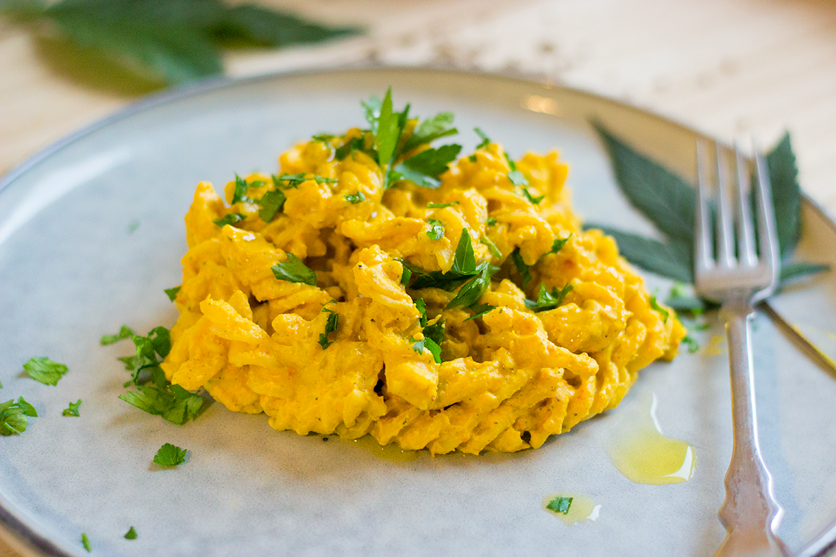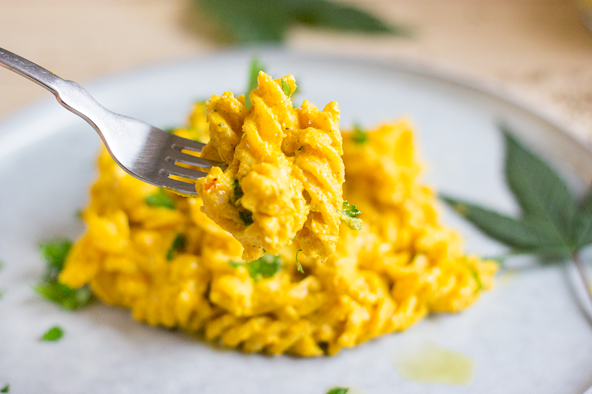Ultra kremowy i obłędnie pyszny wegański makaron à la mac n cheese, to coś, co zdecydowanie umili Ci piątkowy wieczór. Jego przygotowanie nie zajmie zbyt dużo czasu, musisz tylko poczekać aż upiecze się dynia i ugotuje makaron. Ot co. Niezwykle kremowy sos, który imituje klasyk na bazie roztopionego sera, to zasługa nie tylko dyni ale też maślanych nasion konopi w wersji łuskanej. Kilka dodatków takich jak sok z cytryny, czosnek i przyprawy i możesz się cieszyć wyborną pastą, której nie powstydziłby się włoski mistrz kuchni.
