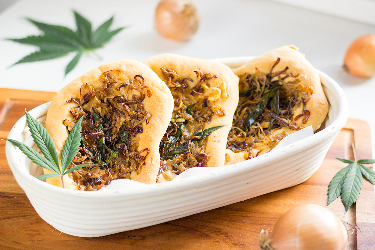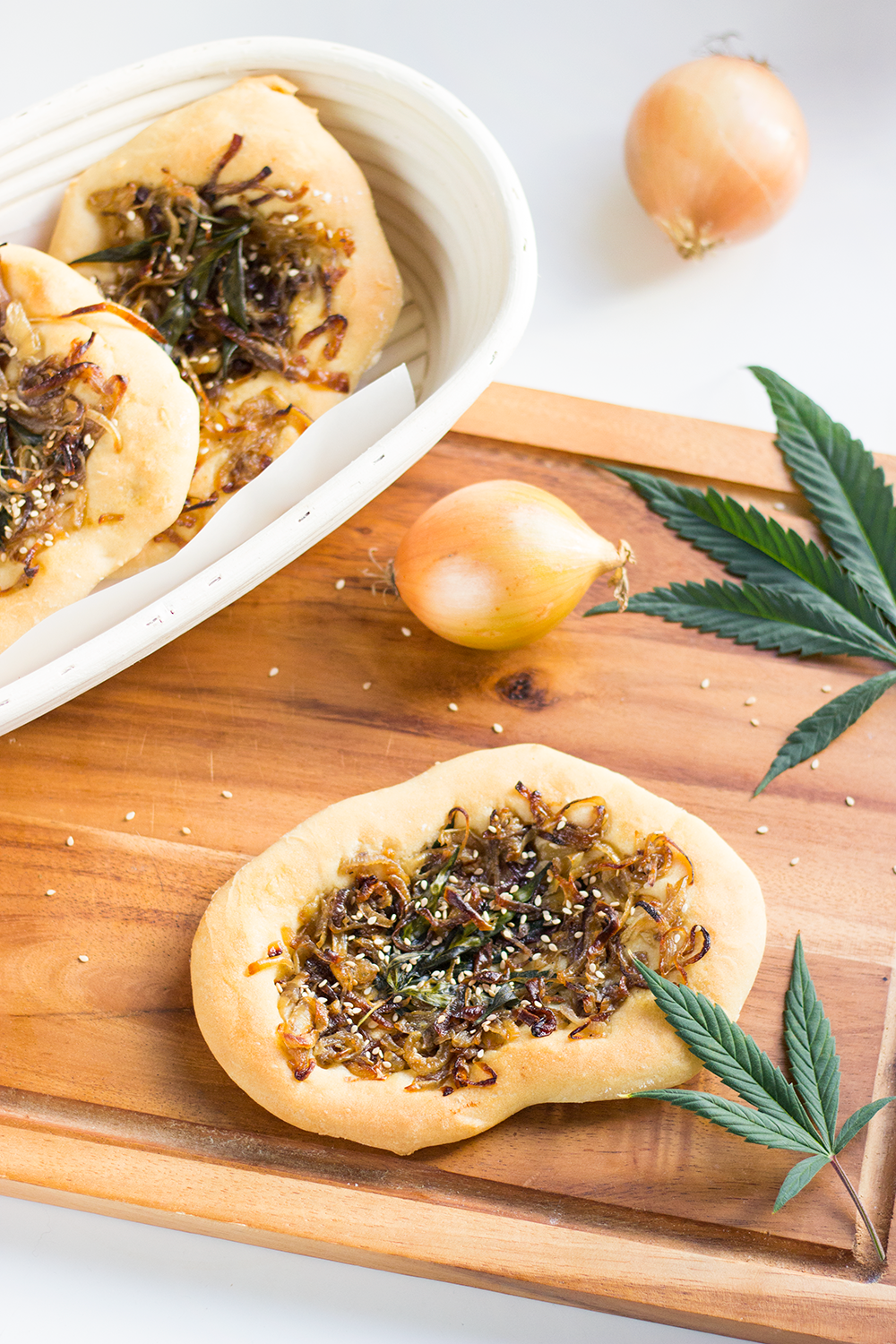 Jestem rodowitą Lublinianką i miłość do cebuli mam we krwi. Cebularze to kulinarna chluba naszego regionu, nie bez powodu mówi się, że te najlepsze pochodzą z Lubelskiego. Na śniadanie jadało się je posmarowane masłem, potem z plasterkiem sera na obiad, zaś na kolacje najczęściej z piwkiem (co za czasy!). Wiele przeprowadzek i zmiana miejsca zamieszkania w pewnym sensie oddzieliły mnie od moich korzeni, ale miłość do potraw z udziałem cebuli to trochę moje dziedzictwo :D. Dlatego korzystając z okazji chciałabym zapoznać was z tym wyjątkowym i bardzo prostym daniem i zaprezentować wam jego konopną wariację. Klasyczny cebularz to drożdżowa bułka na bazie mąki pszenne z dodatkiem farszu ze smażonej cebuli z czarnym makiem. Moja wersja farszu zawiera 2 rodzaje smażonej cebuli: żółta i czerwona z dodatkiem konopnych liści, które po spieczeniu są niewiarygodnie chrupiące i dodają ciekawego aromatu. Miłośnicy masła z marihuany proszeni są o posmarowanie nim ciepłego jeszcze cebularza.
