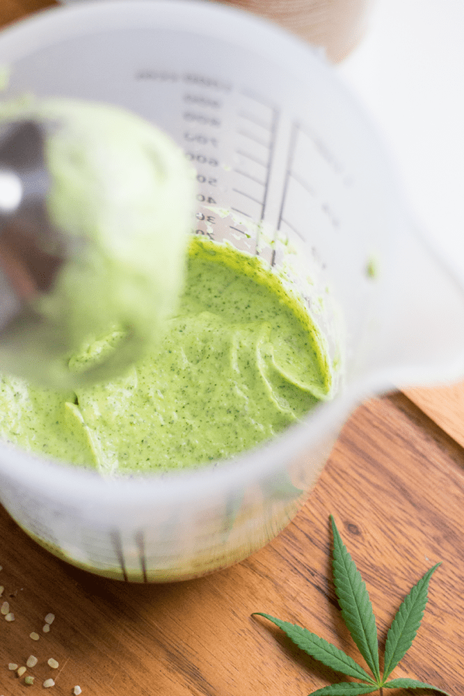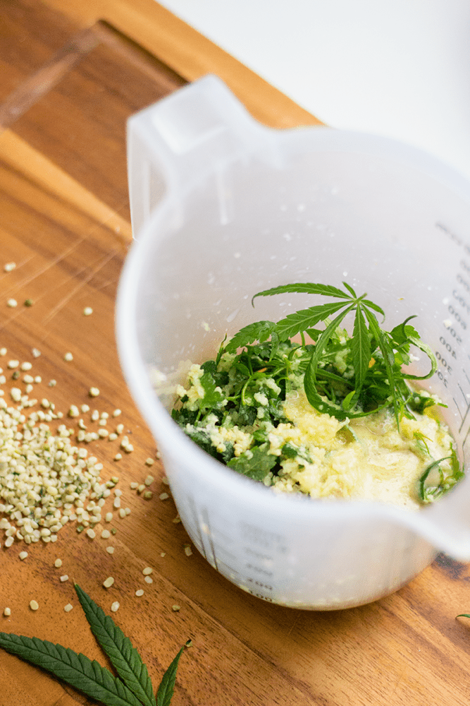 Szczególnie te mniejsze, położone wyżej kawiatostanów są delikatniejsze i zdecydowanie bardziej smaczniejsze. Liście konopne są bogate w mikroelementy i witaminy, są także skarbnicą chlorofilu, związku o właściwościach oksydacyjnych i oczyszczających. Jedzenie liście konopnych pomaga w procesach detoksykacyjnych krwi, przewodu pokarmowego, wspomaga rozwój korzystnej flory bakteryjnej jelit, pomaga też utrzymywać równowagę kwasowo-zasadową naszego organizmu. Liście konopne są także bardzo smaczne, te większe bywają niego gorzkie, ale mniejsze są pyszne, smakują trochę jak liście rzodkiewki. Osobiście uwielbiam ich smak. Na ich bazie można przyrządzić pesto lub inne sosy, jak mój zielony sos z dodatkiem nasion konopi i wegańskiego jogurtu, może je też dodać w całości jako składnik sałaty.