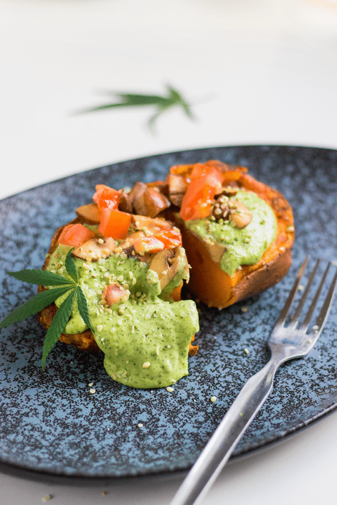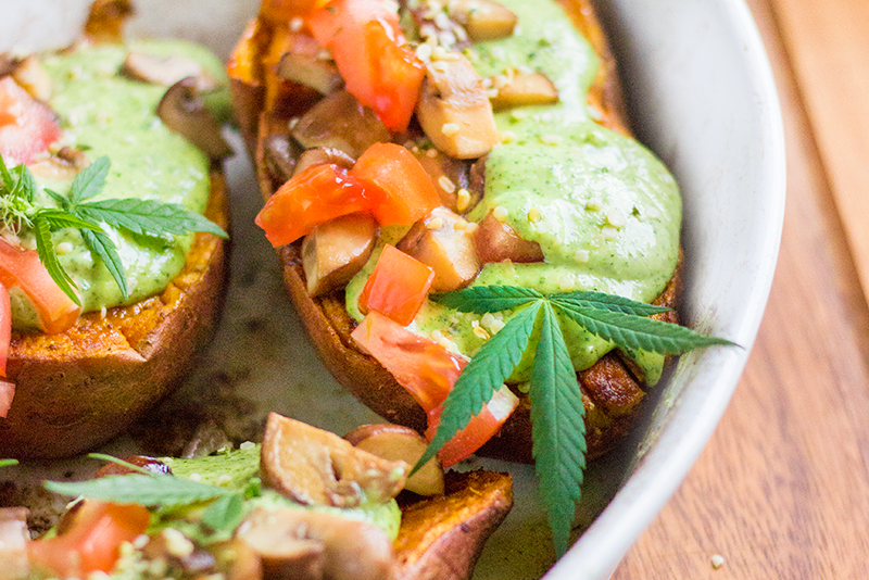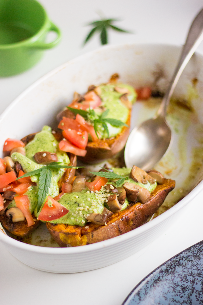 Sezon pieczonych warzyw wcinanych przed kominkiem lub przynajmniej, takim odpalonym na telewizorze, powoli dobiega końca. Mogłabym zajadać się nimi przez cały rok, ale chętnie zrobię miejsce na wiosenne nowalijki. Tymczasem sezon ten postanowiłam zamknąć z przytupem, bez nudy, tak by na jesień przypomnieć sobie te smaki na nowo. W tym celu upiekłam ukochane przeze mnie bataty (słodkie ziemniaki) w mundurkach i następnie zaserwowałam z obłędnym zielonym sosem na bazie konopnych liści i nasion konopi z pysznymi dodatkami w iście konopnym stylu.