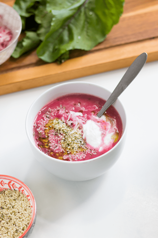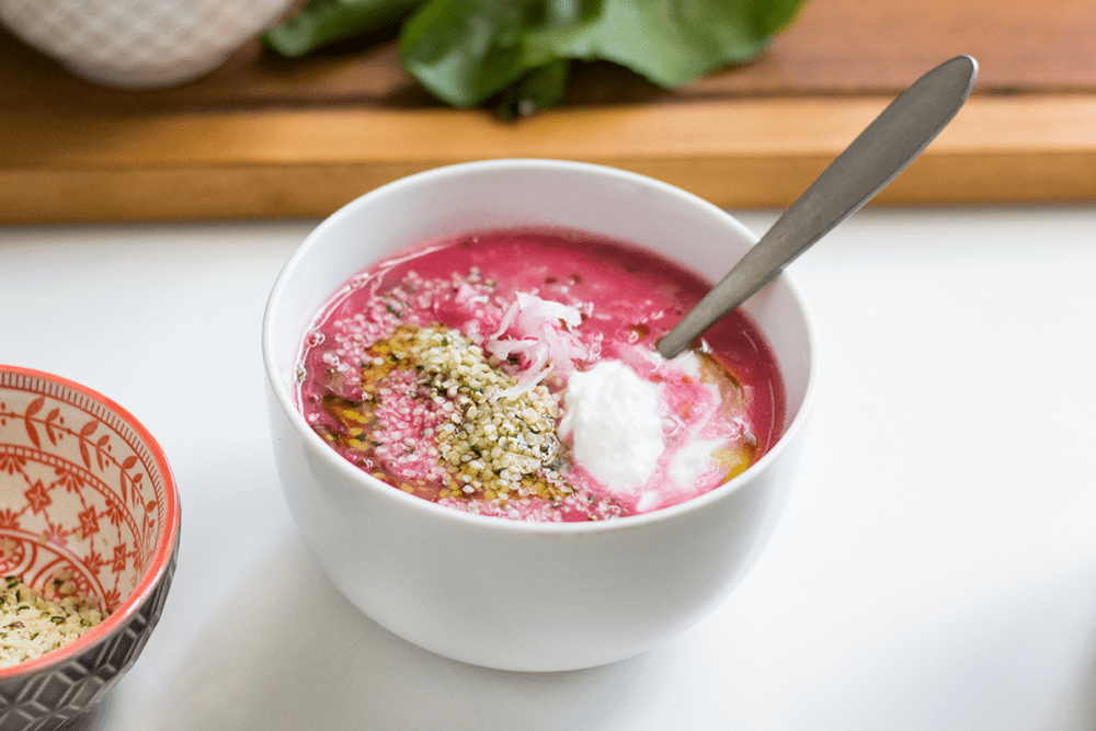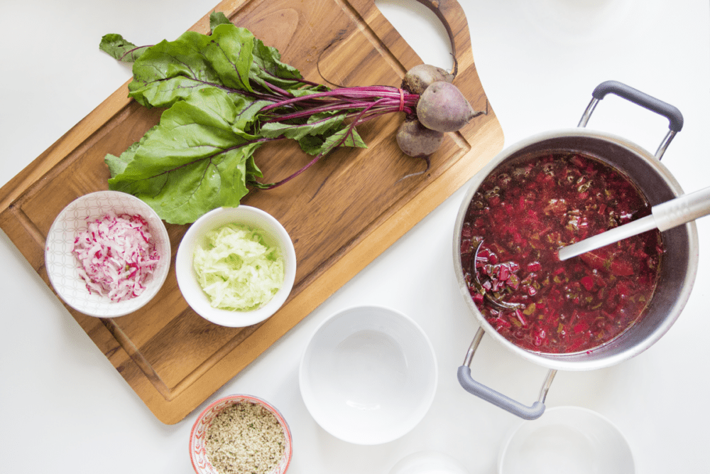 Moją botwinkową przygotowuję trochę inaczej niż moja babcia. Po pierwsze jest to wersja 100% wegańska, włącznie z roślinną śmietaną. Ponadto odkryłam, że łuskane nasiona konopi siewnych pasują do niej idealnie. Nie tylko wzbogacają smak i sprawiają, że zupa jest bardziej pożywna (duża zawartość białka). Nasiona konopi dostarczają ogromnej ilości fitoskładników, co czyni tę wyjątkową zupę super pokarmem.
