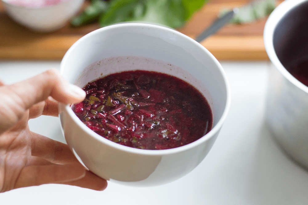 Kroję całą botwinkę (włącznie z liśćmi) w drobne kawałki a następnie podsmażam na patelni kawałki bulwy i łodygi z odrobiną czosnku i z dodatkiem oliwy z oliwek. Gdy kawałki botwinki robią się miękkie zalewam je bulionem warzywnym, dodaję liście botwiny, odrobinę soku z cytryny i doprowadzam do wrzenia a następnie gotuję około 10 – 15 min. Na koniec dodaję śmietankę wegańską, sól, pieprz i świeży koperek.